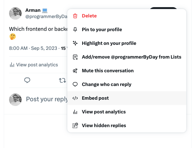 - Open the tweet you want to embed in twitter (recently X.com):
